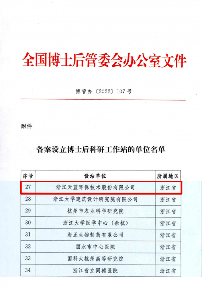 浙江天藍環(huán)保技術(shù)股份有限公司獲批國家級博士后工作站,標志著天藍環(huán)保在人才隊伍、技術(shù)創(chuàng)新和科研平臺建設(shè)上的重大突破。