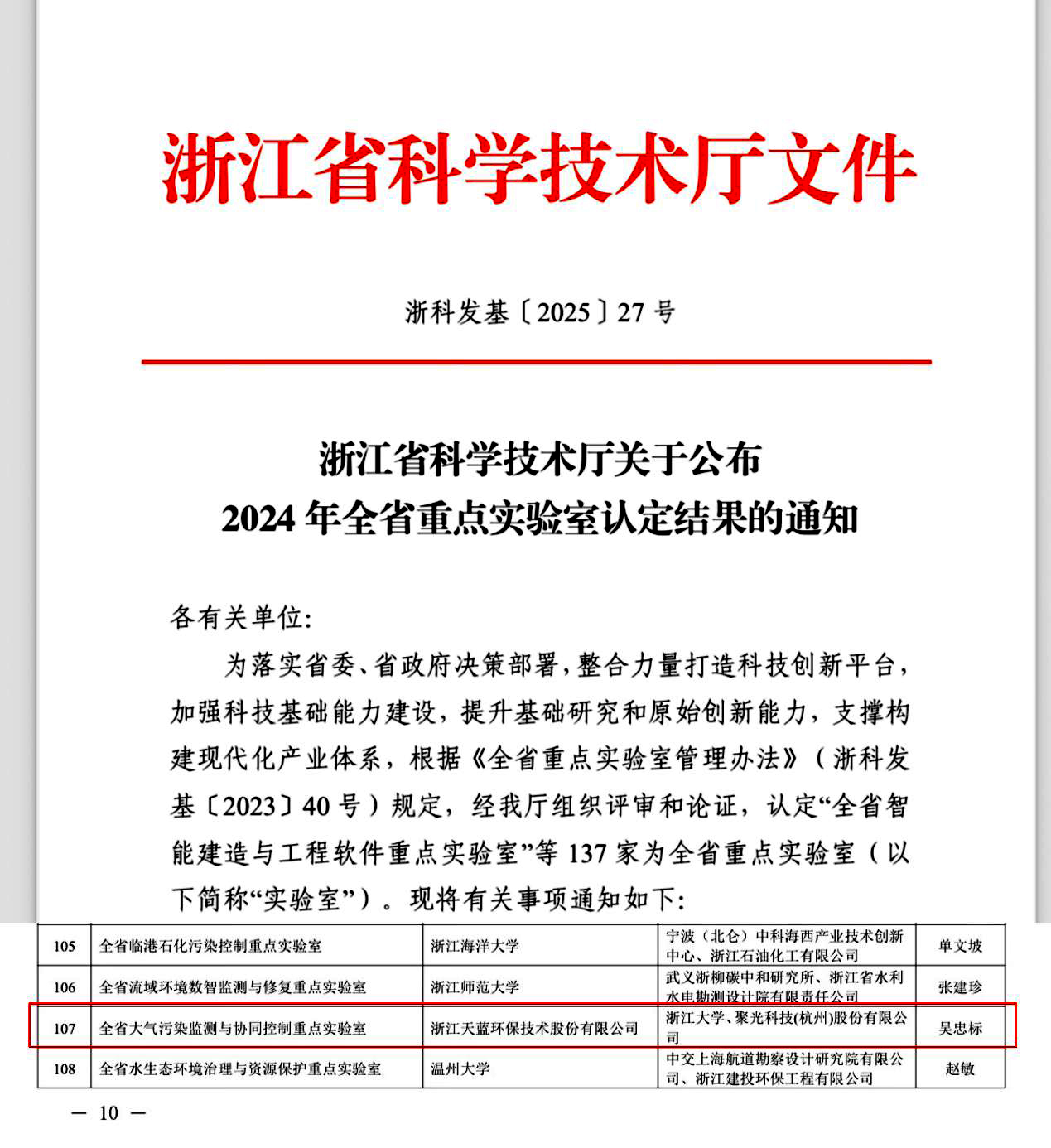 2025年6月4日,浙江省科技廳發(fā)布《浙江省科學技術(shù)廳關(guān)于公布2024 年全省重點實驗室認定結(jié)果的通知(浙科發(fā)基〔2025〕27號)》,由浙江天藍環(huán)保技術(shù)股份有限公司牽頭,浙江大學和聚光科技(杭州)股份有限公司共建的“全省大氣污染監(jiān)測與協(xié)同控制重點實驗室”獲批組建,成為全省環(huán)境領(lǐng)域唯一以企業(yè)牽頭建設(shè)的省級重點實驗室